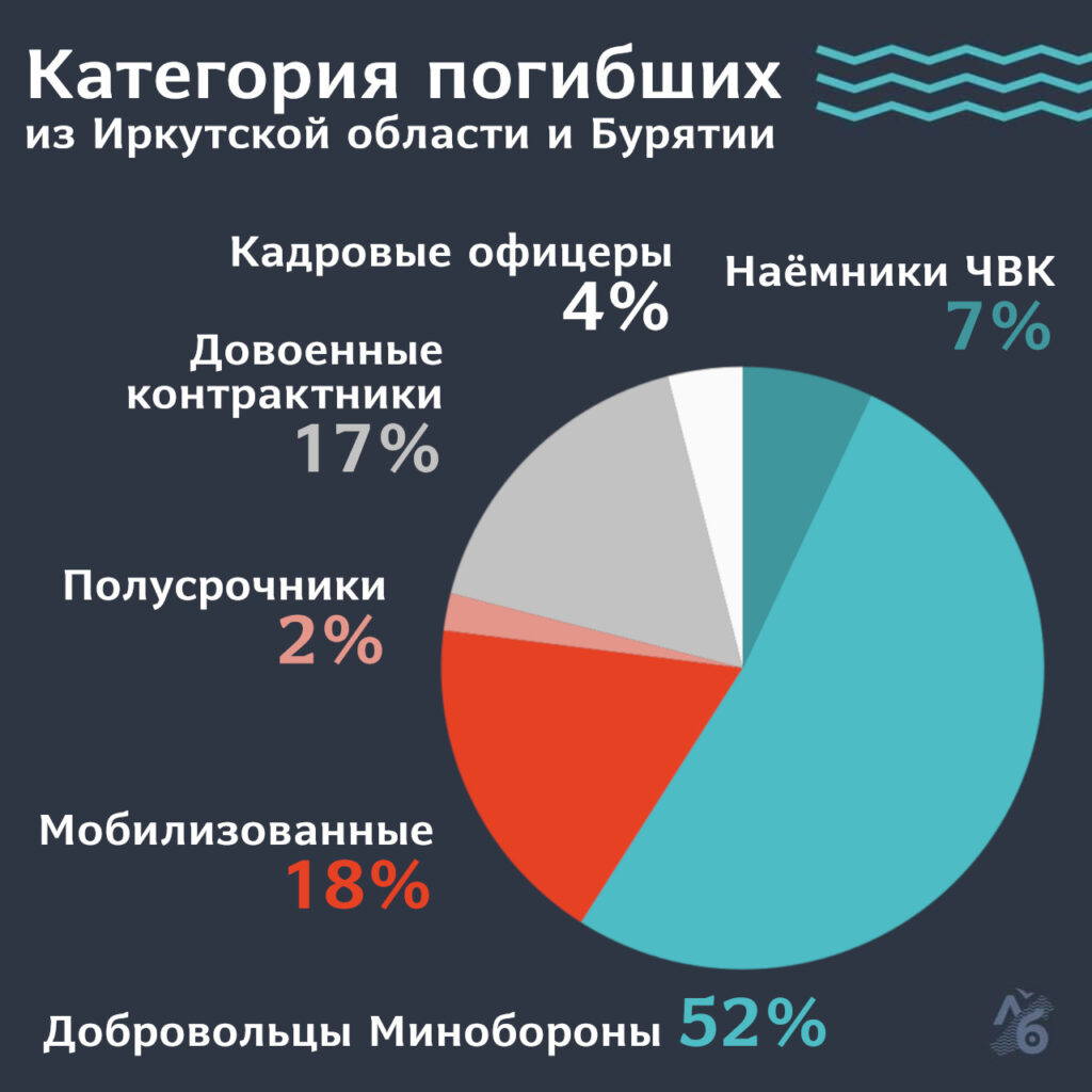 Мобилизованные составляют 18% от всех погибших. На данный момент в Бурятии погибло минимум 685 из 4000 мобилизованных, или 16%. В Иркутской области погибло минимум 656 из 5000 мобилизованных, или 13%. Подробнее о том, как складывается на фронте сценарий жизни мобилизованных жителей Прибайкалья, читайте в нашем материале «Мобилизованы и погибли».