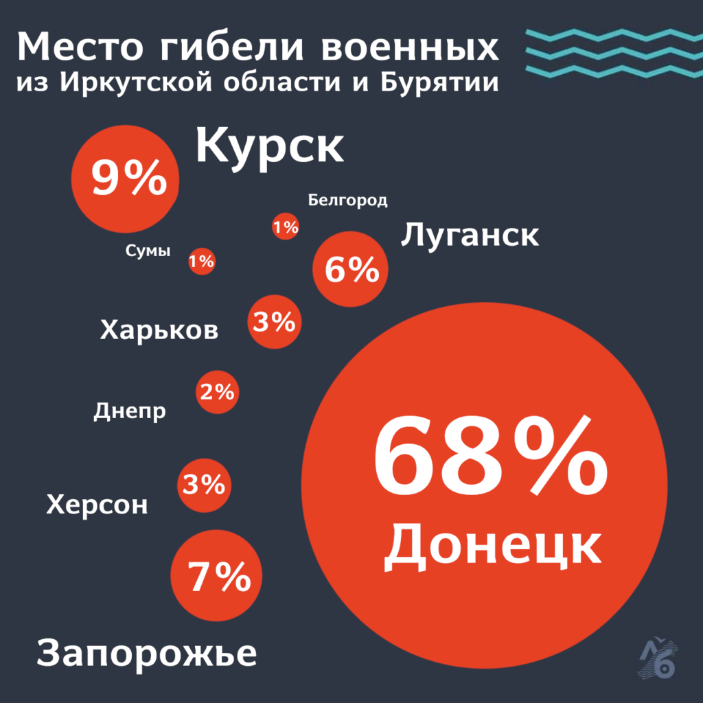 На протяжении всей войны две трети погибших привозят в Прибайкалье из-под Донецка, где уже четыре года идут самые ожесточенные бои. Все остальные участки фронта вместе взятые дают одну треть погибших. После донецкого, наиболее кровопролитными участками фронта стали курское (9% погибших), запорожское (7%) и луганское (6%) направления.