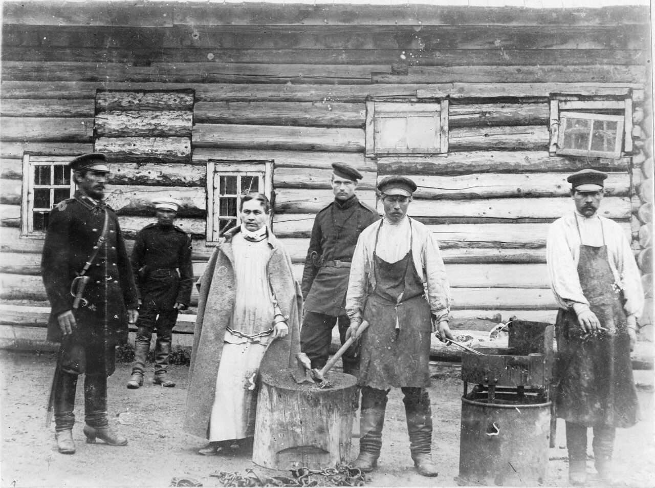 Её ставили около наковальни, тут же расставляли кузнецов с молотами, надзирателей, — и местный фотограф снимал якобы сцену заковывания «Золотой ручки». Эти фотографии продавались десятками на всех пароходах, приходивших на Сахалин.