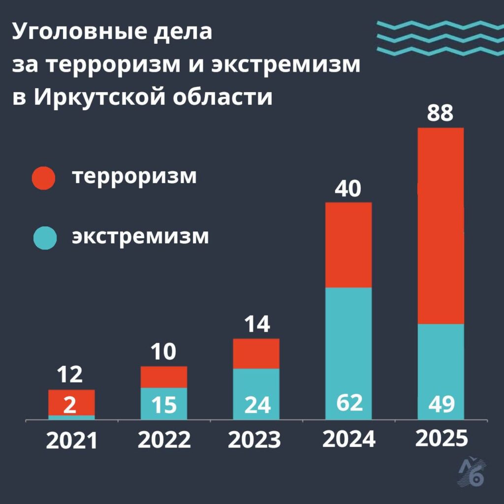 Зато в Иркутской области продолжает расти количество дел по террористическим (88) и экстремистским (49) статьям. Напомним, что в последний предвоенный год было лишь 12 и 2 таких дел соответственно — в десять раз меньше.