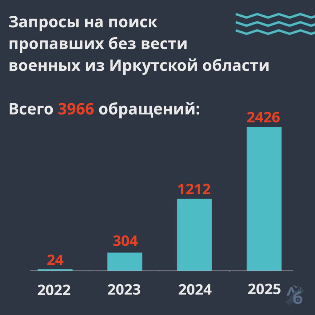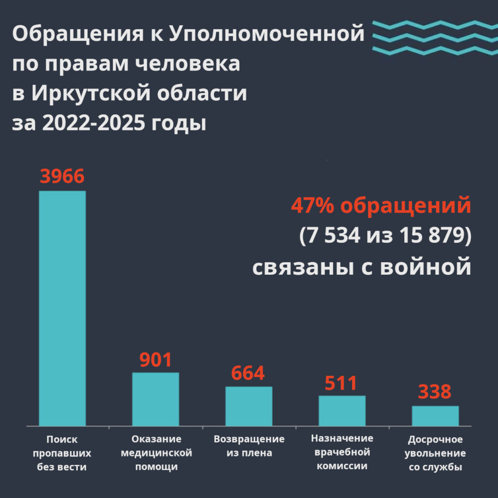 Чаще всего люди обращаются с просьбой найти родных, пропавших без вести в зоне боевых действий. С начала войны таких обращений в Иркутской области было 3966, причем две трети из них пришлись на последний год. Более того, реальное число пропавших должно быть больше, так как за помощью к уполномоченной обычно обращаются, когда остальные инстанции пройдены — не получается добиться ответа в Министерстве обороны или у местных чиновников.