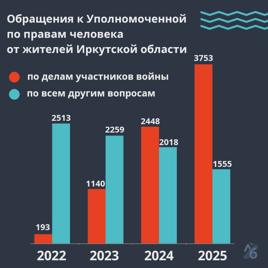 Уполномоченная по правам человека в Иркутской области Светлана Семенова рассказала, что число обращений в ее службу от участников войны и их родственников за четыре года выросло в 20 раз и составляет теперь 70% общего потока. В Бурятии эта доля еще выше — 80%. Из-за войны объем работы омбудсмена вырос в два раза — с с 2706 до 5308 обращений за год.